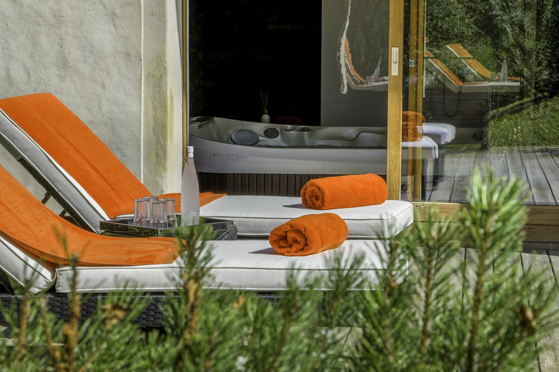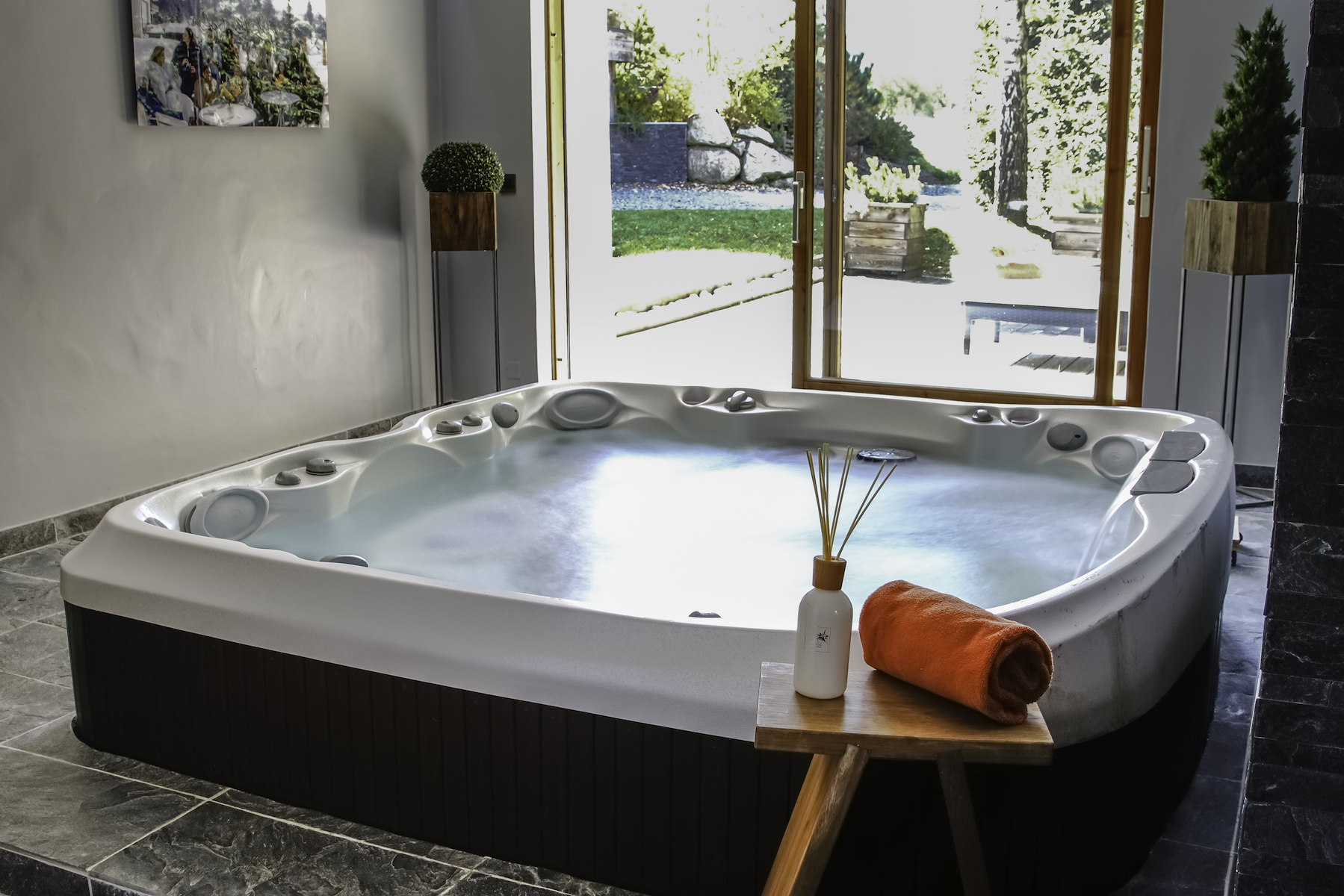 Jacuzzi, douche hammam double, salle de sport, appareils de fitness.